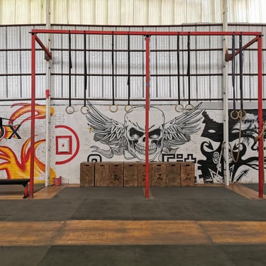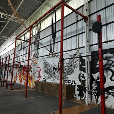 Estaciones de crossfit, power rack pull ups, squat rack, trineo de entrenamiento (power sled), banco GHD, dip horn, rack de almacenamiento de mancuernas, rack de almacenamiento de barras, rack de almacenamiento de discos, etc.